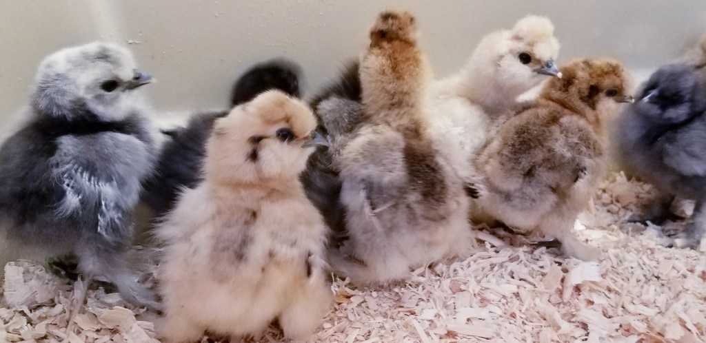 I currently have one week old silkie chicks available. They are $16 each. The chicks are not sexed. I have 1 grey, 1 grey partridge, 4 partridge and 2 black.