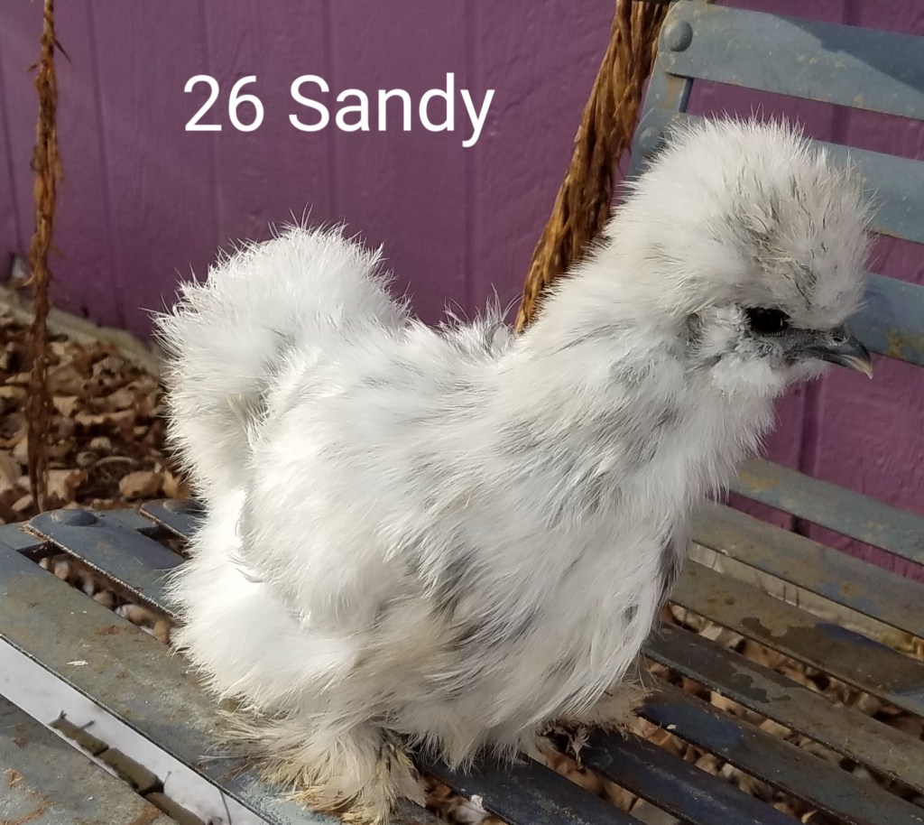 Sandy is a splash colored, 4 month old female silkie pullet. She is $85. SOLD