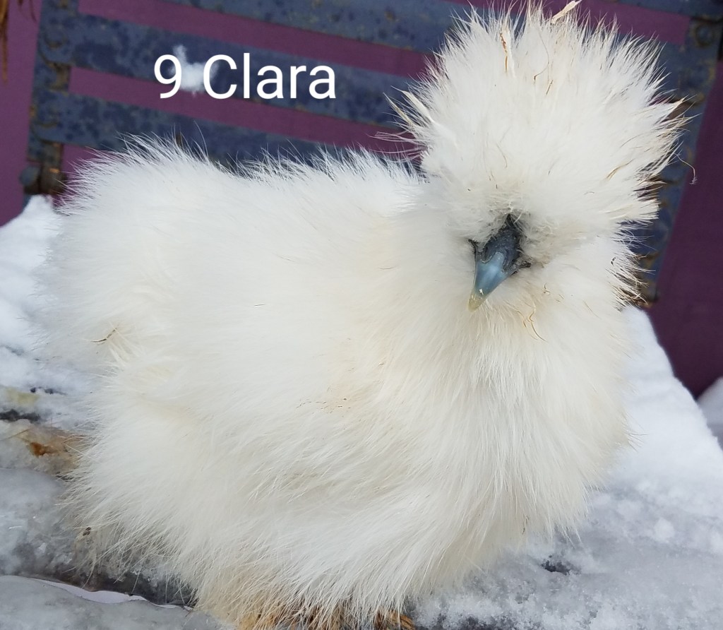 Clara is a white colored, 4 month old, female silkie pullet. She has two curled toes. She is $65