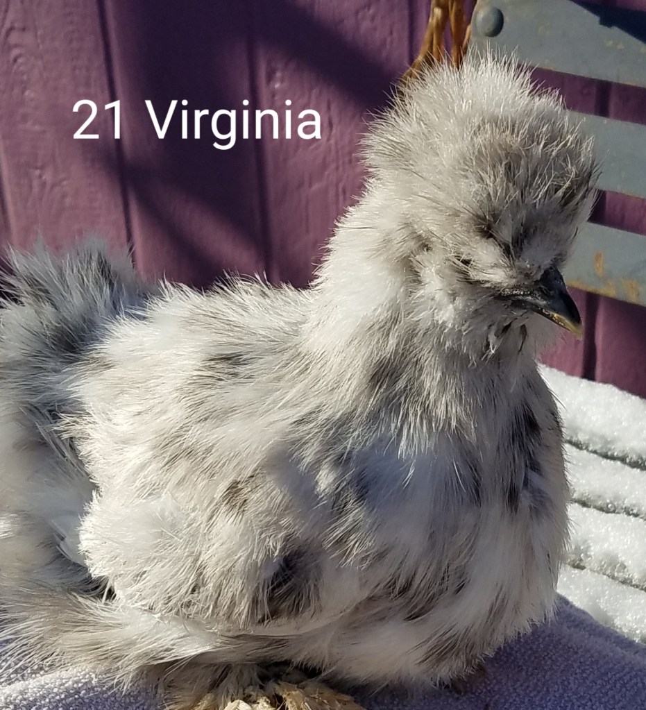 Virginia is a splash colored, 4 month old female silkie pullet. She is $85.