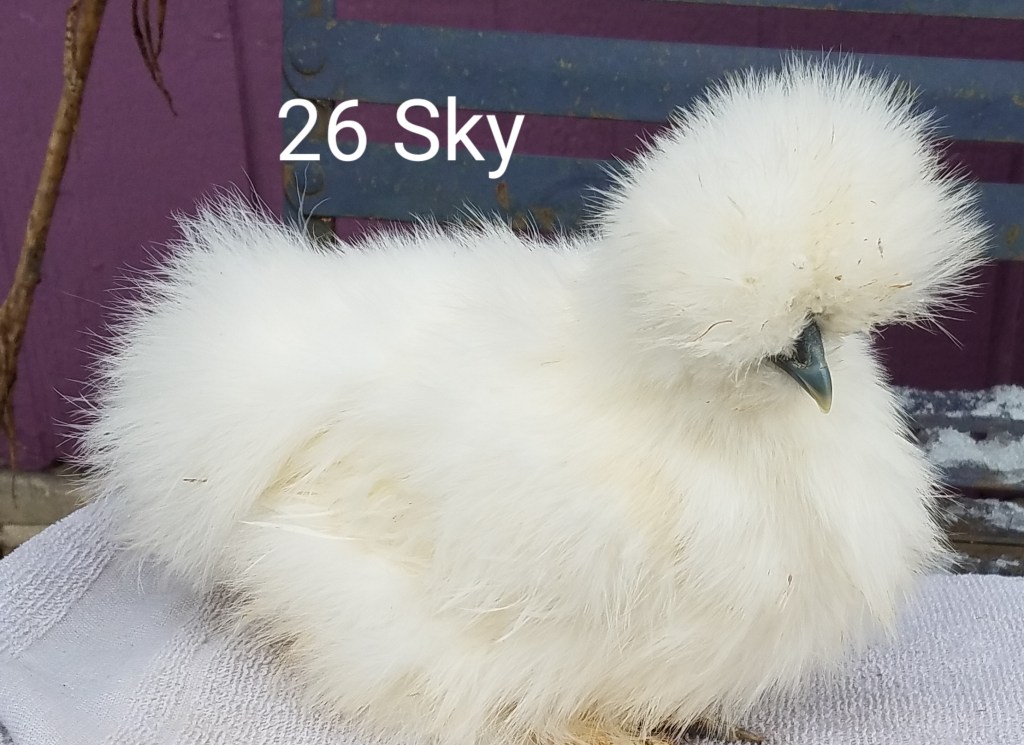 Sky is a white colored, 4 month old female silkie pullet. She is $85.