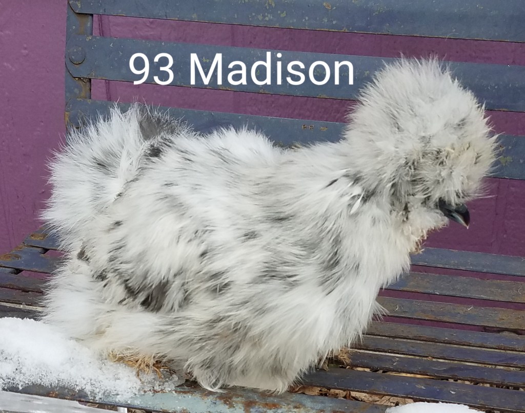 Madison is a splash colored, 4 month old female silkie pullet. She is $85. SOLD