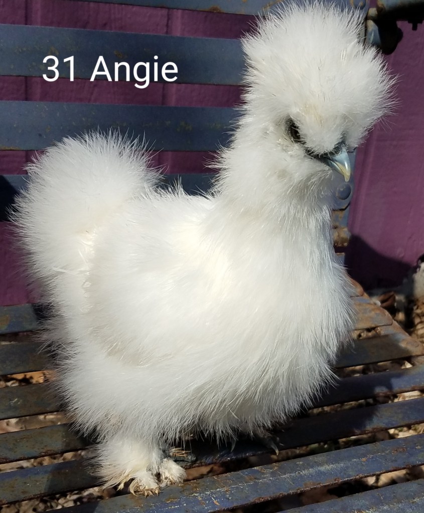 Angie is a white colored, 4 month old female silkie pullet. She is $85. SOLD