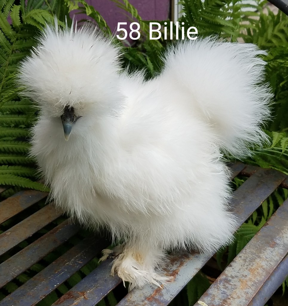 Billie is a white colored, 4 month old MALE silkie cockerel. He is $40. SOLD