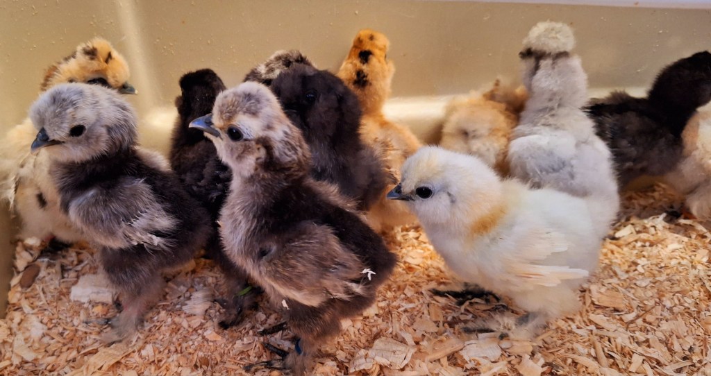 I currently have one week old silkie chicks available. They are $17 each. The chicks are not sexed. I currently have 2 black, 1 striped buff, and 3 white.
