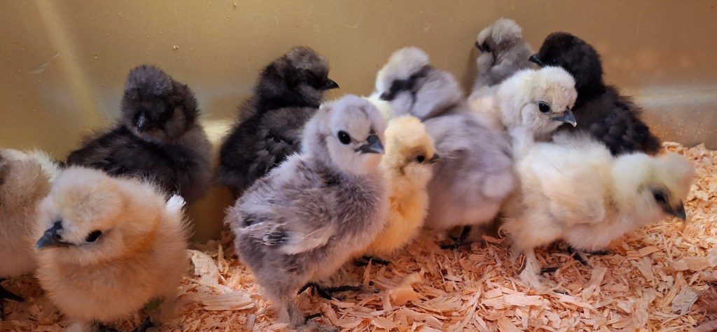I currently have one week old silkie chicks available. They are $17 each. The chicks are not sexed. I currently have 1 grey, 5 splash, 5 white and 4 black.