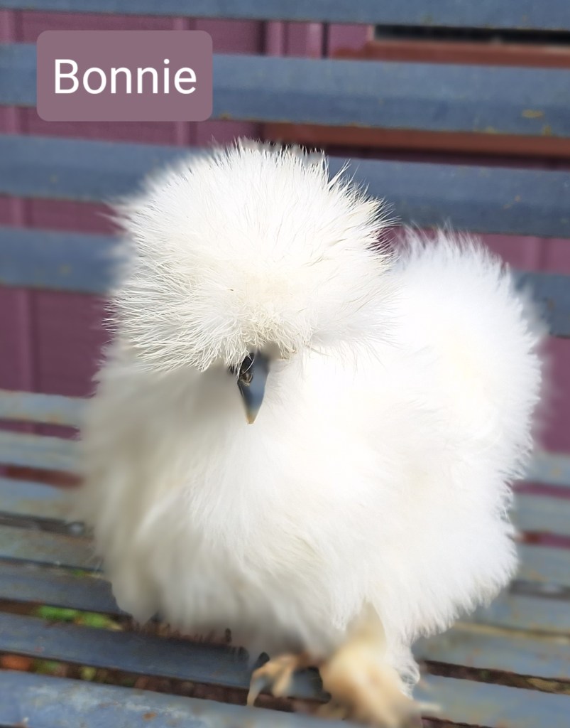 Bonnie is a white colored, 4 month old female silkie pullet. She is $85.