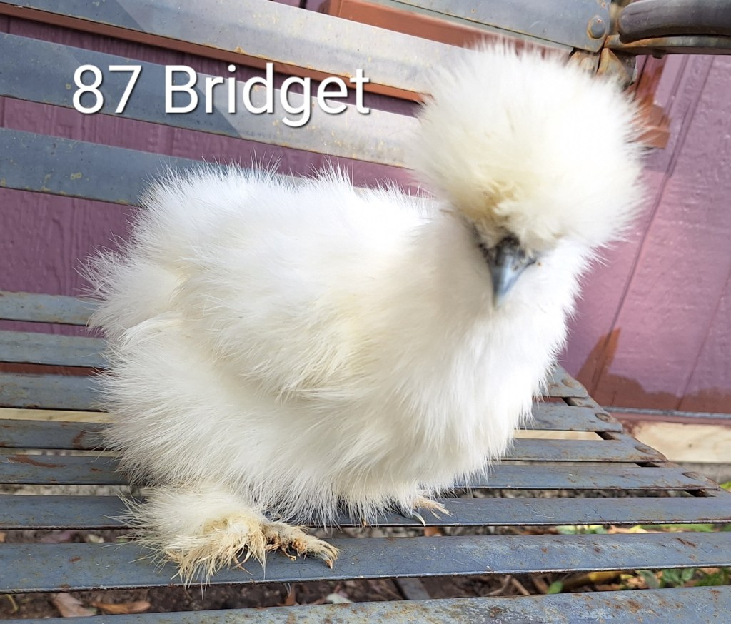 Bridget is a white colored , 4 month old female silkie pullet. She is $85.